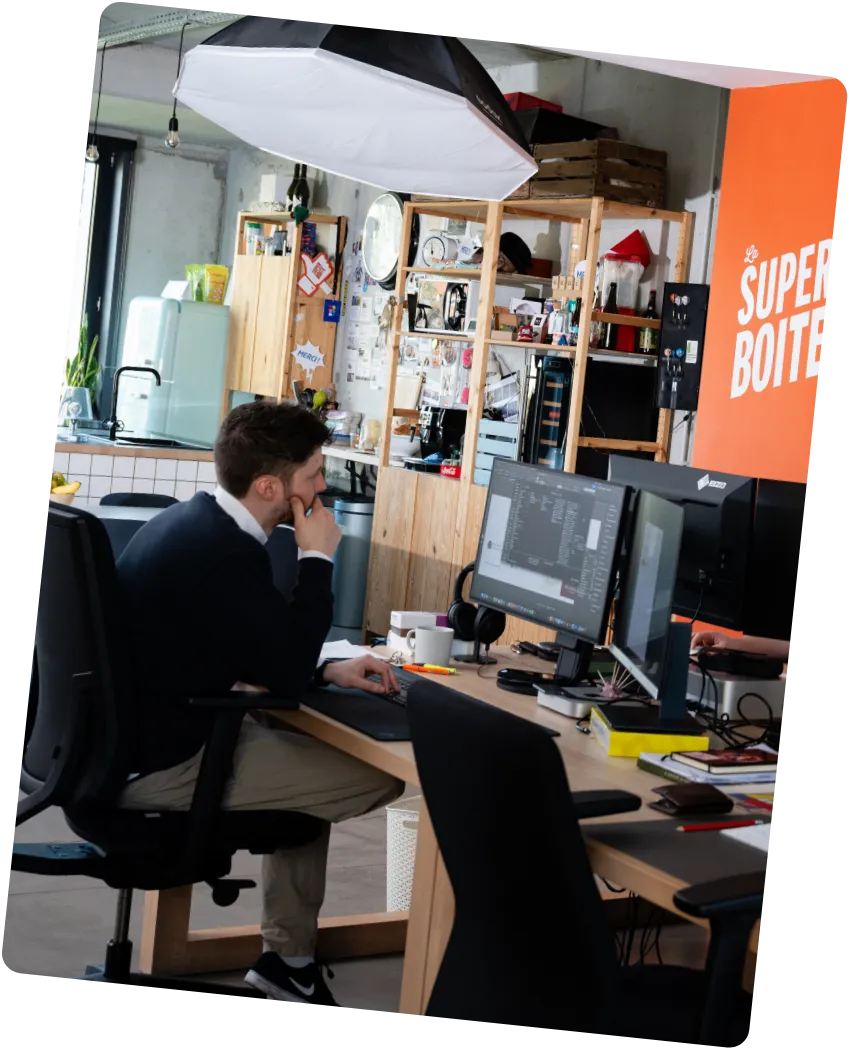 À La Superboite, vous êtes en contact direct avec l’équipe créative. Pas d’intermédiaire, pas de procédures complexes. Notre réactivité et notre proximité nous permettent de répondre à vos besoins de manière agile et adaptée, avec une équipe à taille humaine et polyvalente.